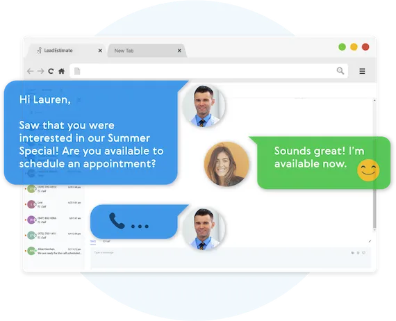 LeadEstimate allows you to connect with your leads through Phone, Voicemail Drops, SMS/MMS, Emails, GMB Messages, and even Facebook Messenger.